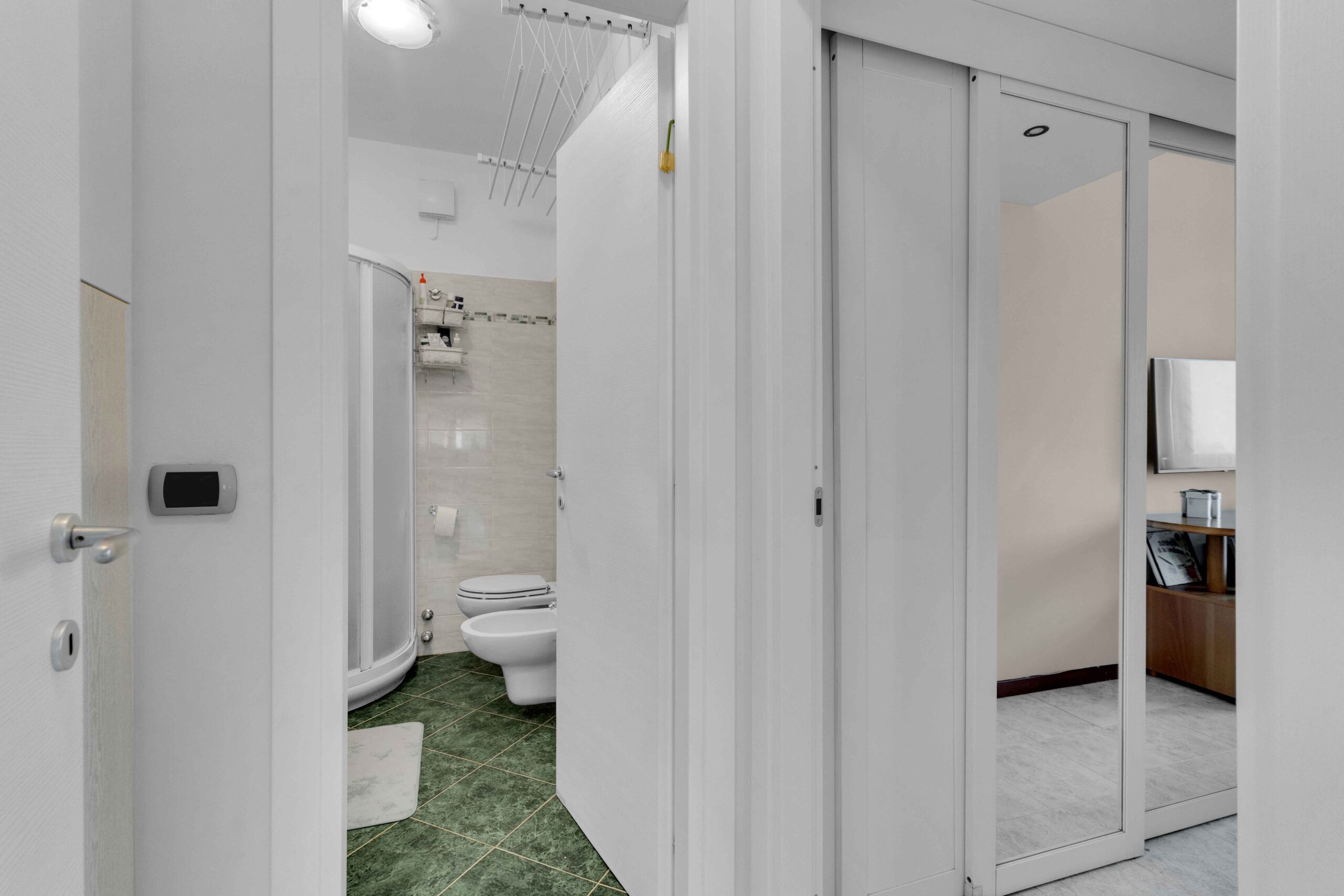 Alla prima si accede dalla zona pranzo dove troviamo un piccolo disimpegno, un bagno con finestra e box doccia e successivamente un’ampia camera. Alla seconda si accede dall’area salotto, anche qui troviamo un disimpegno, un bagno e la camera da letto matrimoniale con cabina armadio. Il box singolo completa la proposta e si trova all’interno della proprietà.