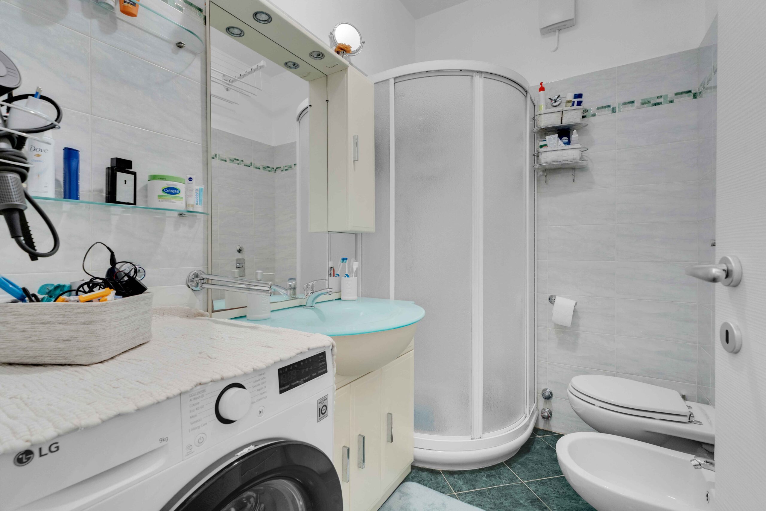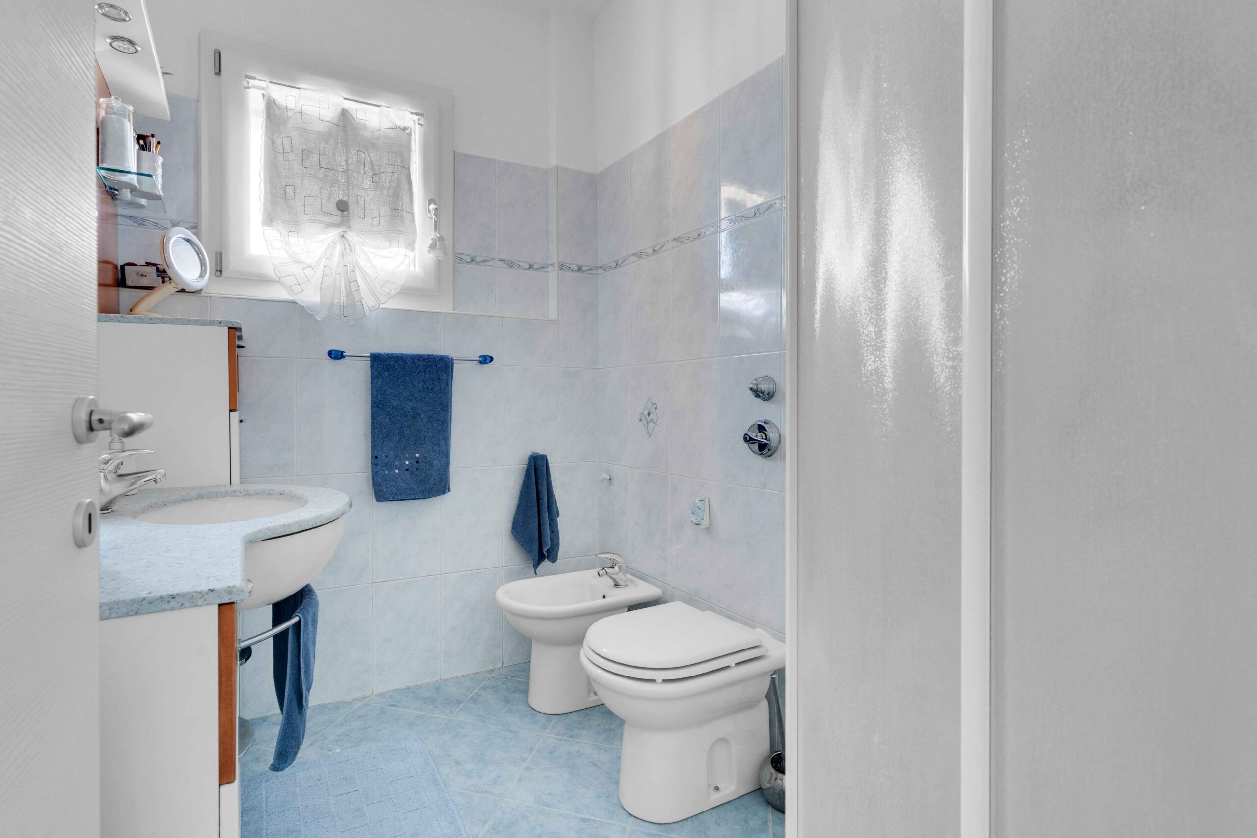 La pavimentazione nella zona giorno è in ceramica chiaro uniformemente distribuita in tutto l’appartamento fatta eccezione dei due bagni dove il colore varia tra l’azzurro ed il verde.