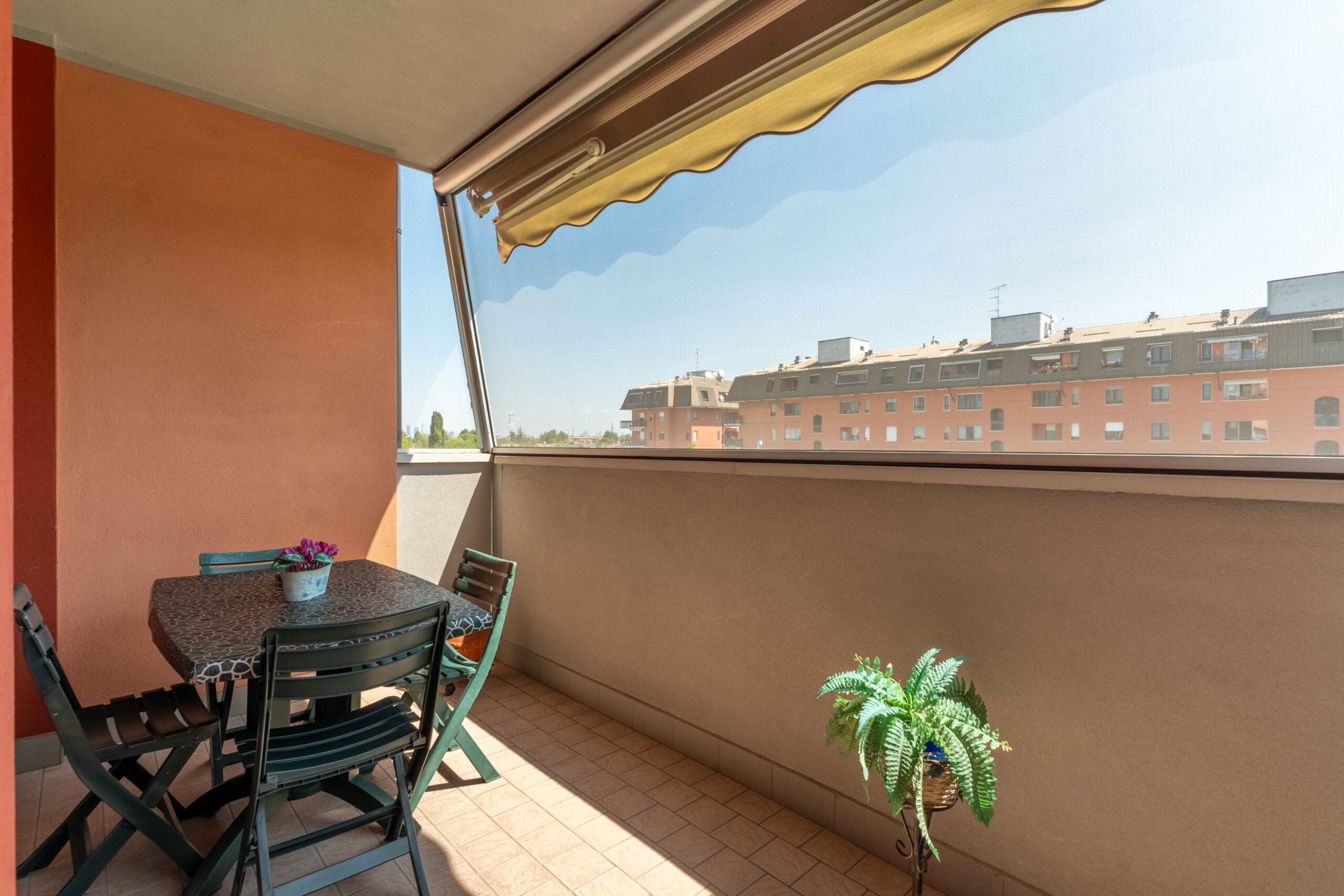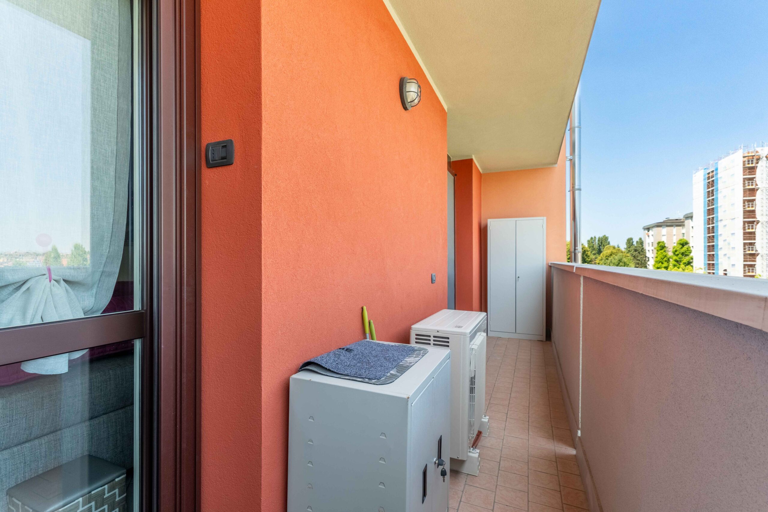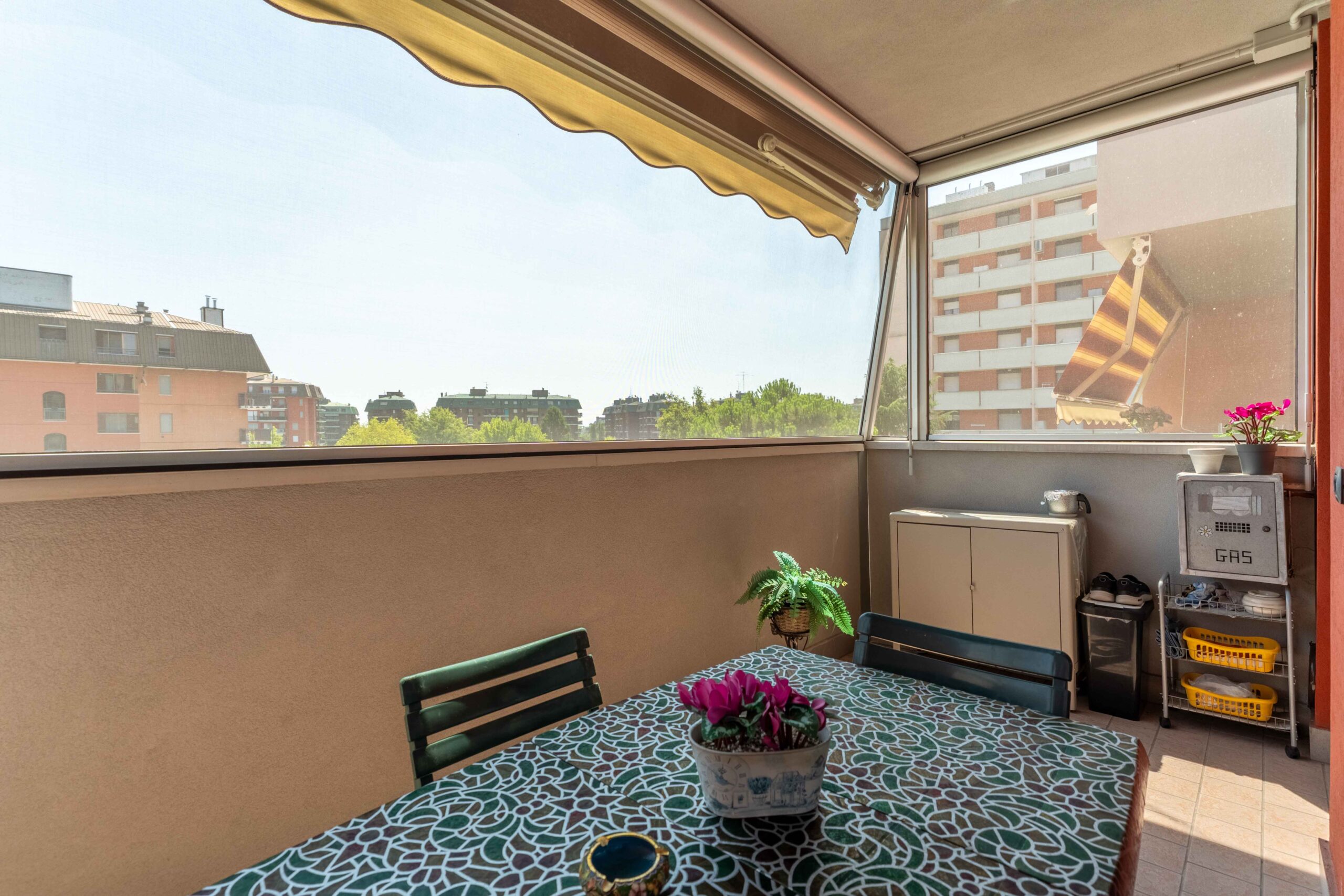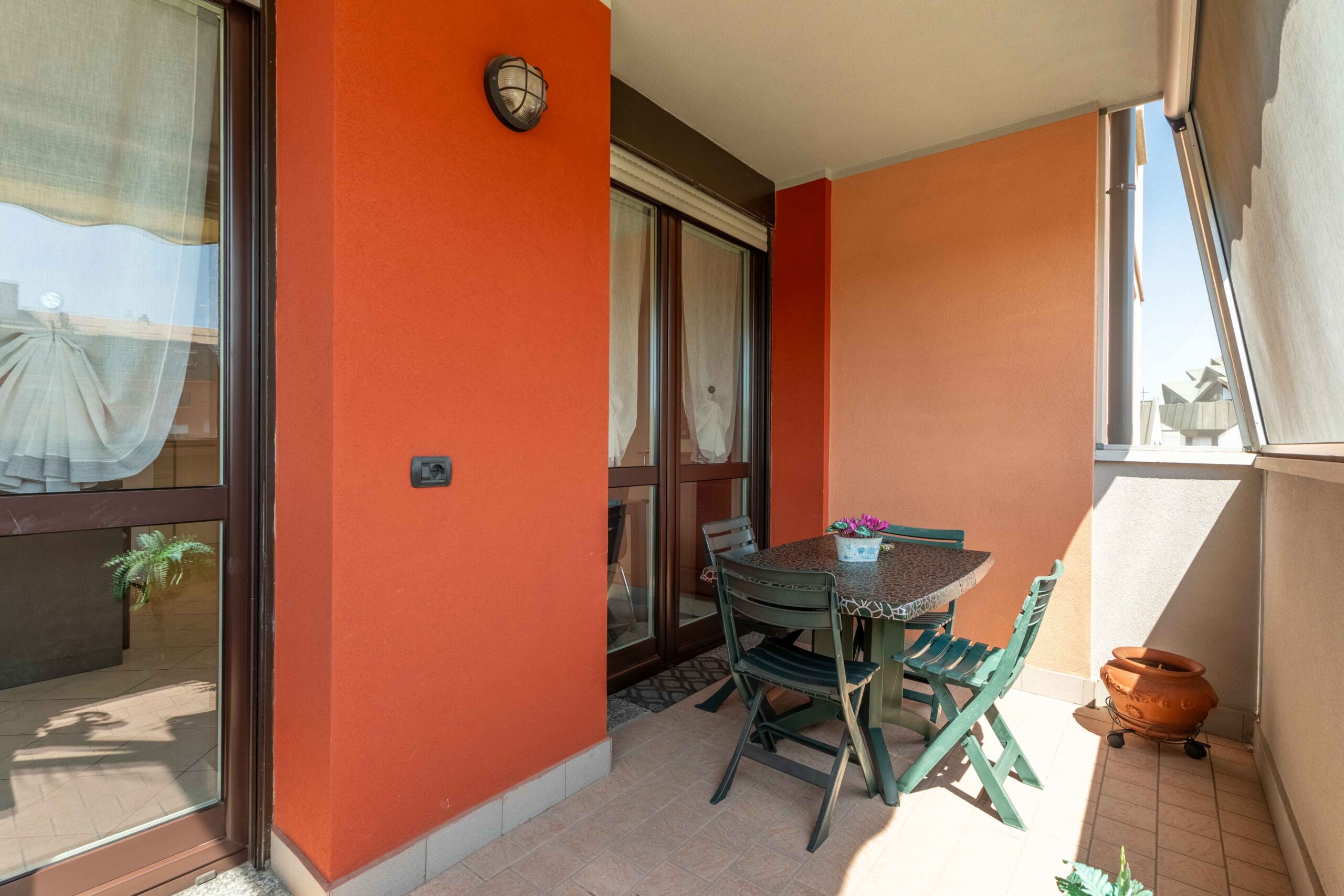 Gli infissi esterni sono di ultima generazione a tenuta termica con profili interni di colore bianco così come le porte interne. La tenda para sole è stata posizionata sul balcone più ampio in quanto esposto ad est che risulta anche protetto da zanzariere a filo balcone.