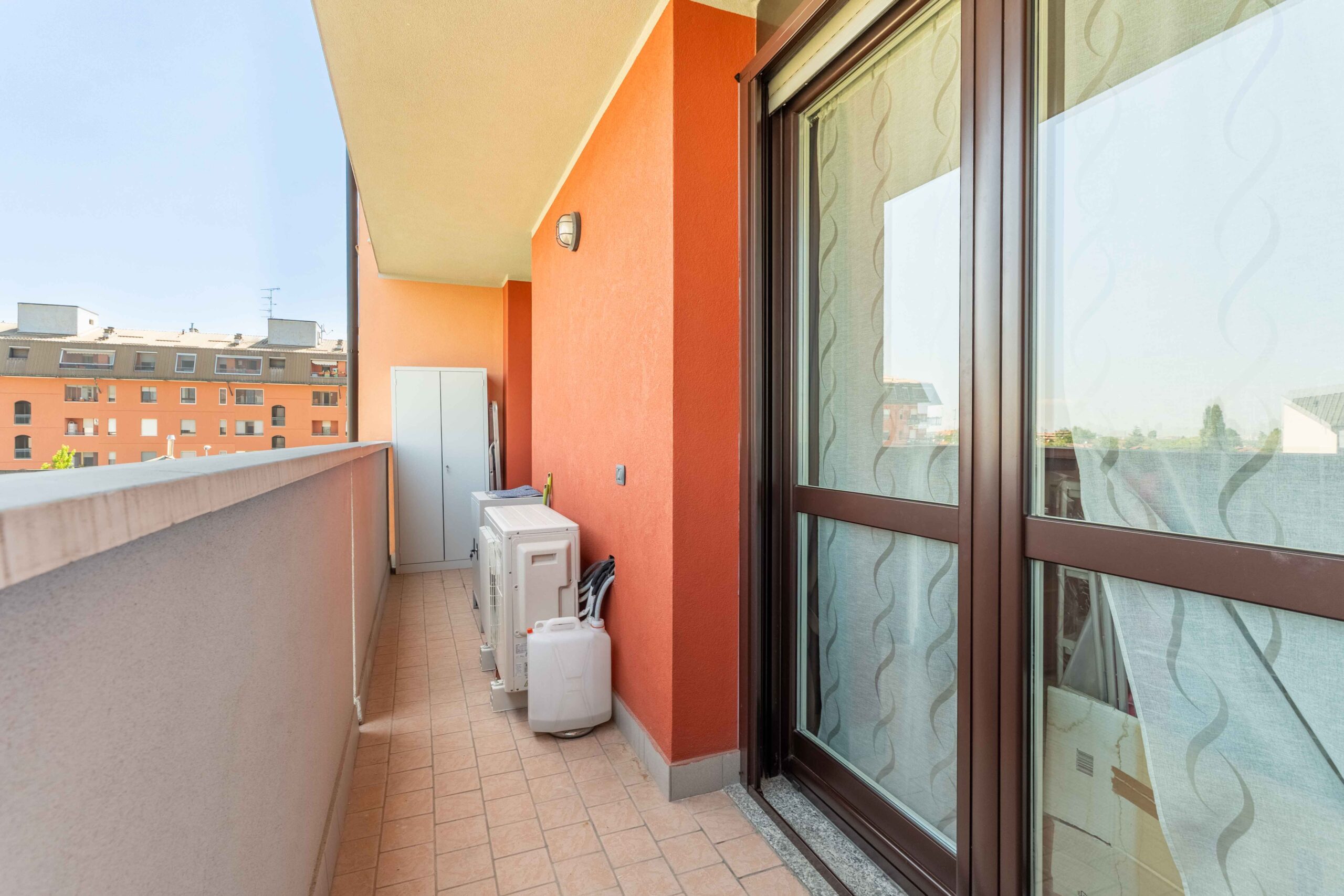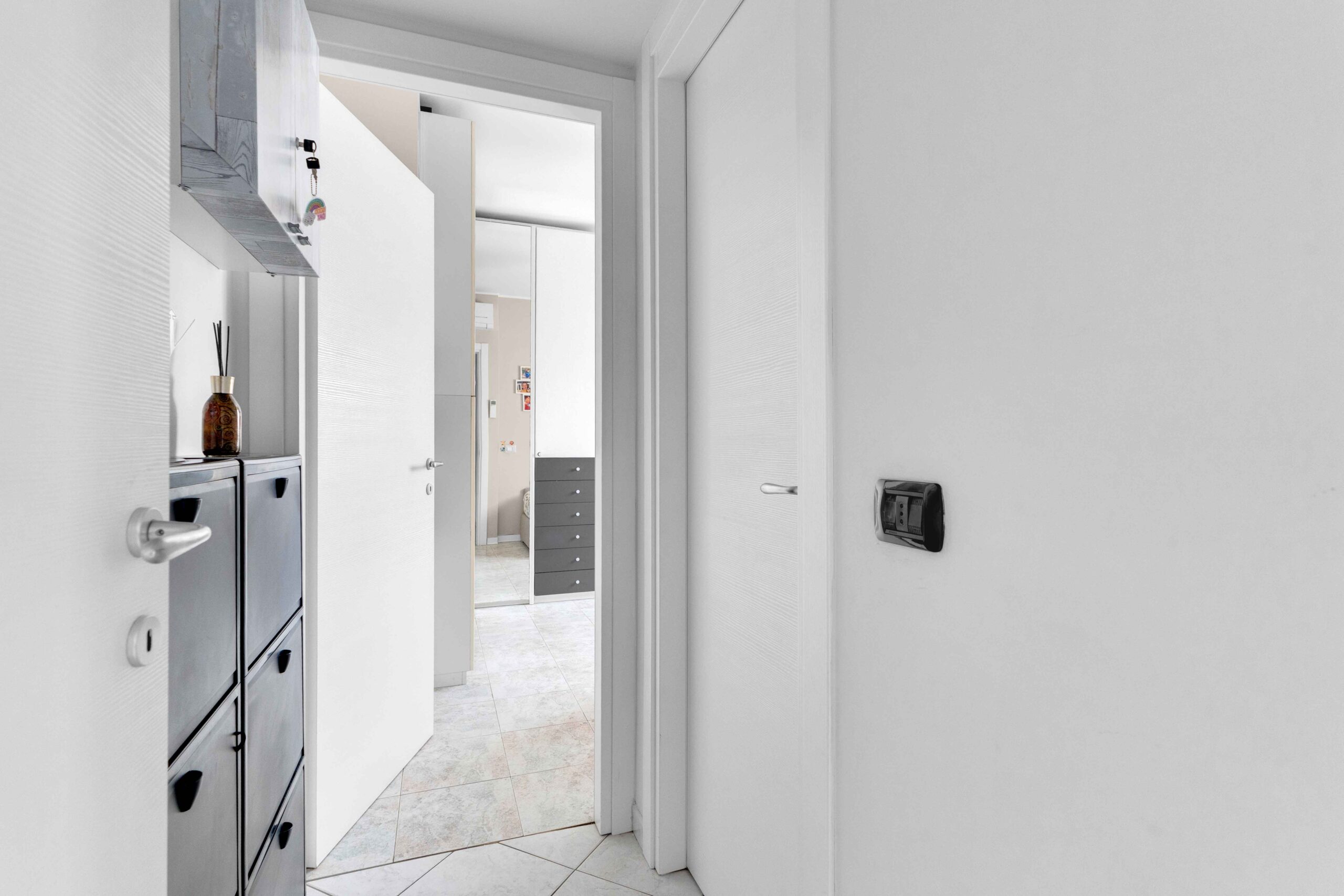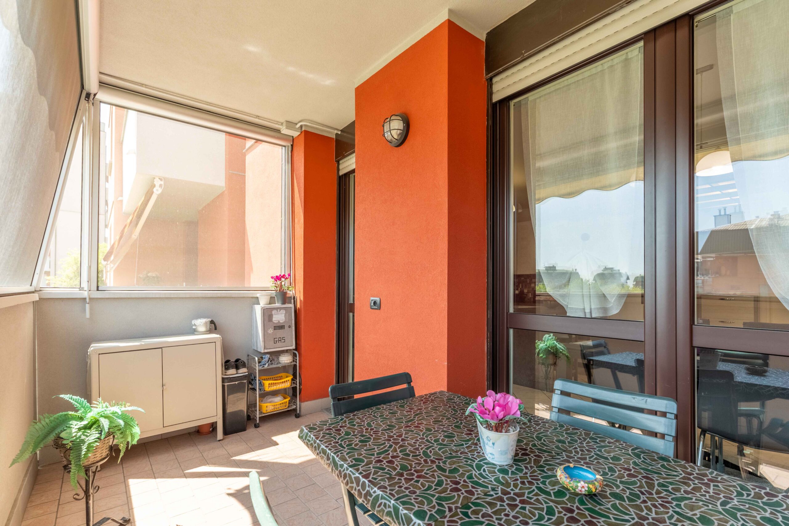 Gli infissi esterni sono di ultima generazione a tenuta termica con profili interni di colore bianco così come le porte interne. La tenda para sole è stata posizionata sul balcone più ampio in quanto esposto ad est che risulta anche protetto da zanzariere a filo balcone.