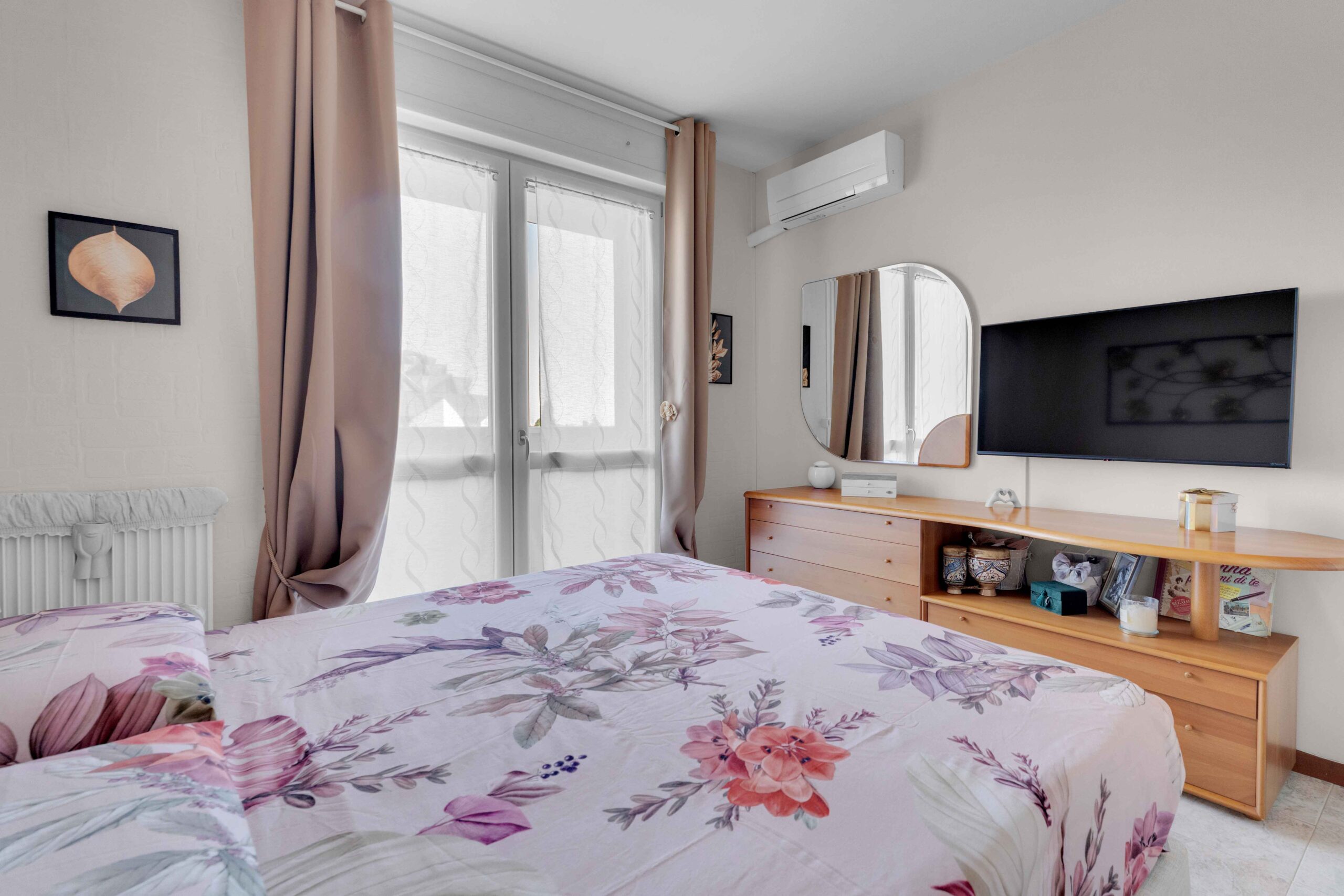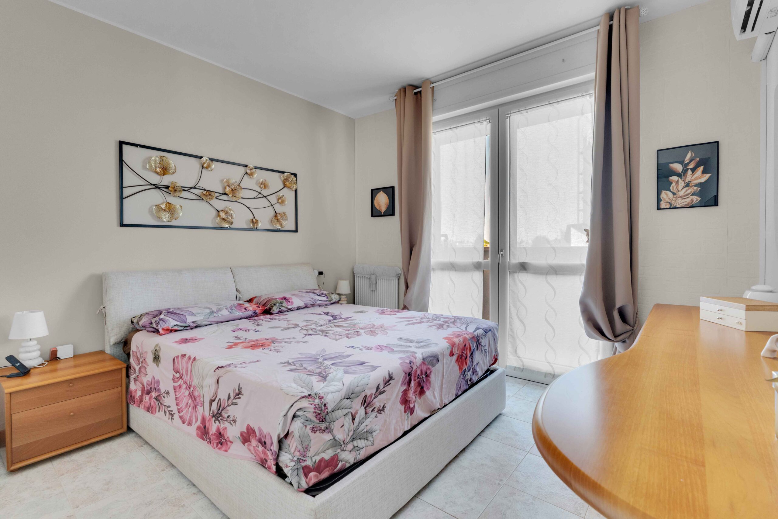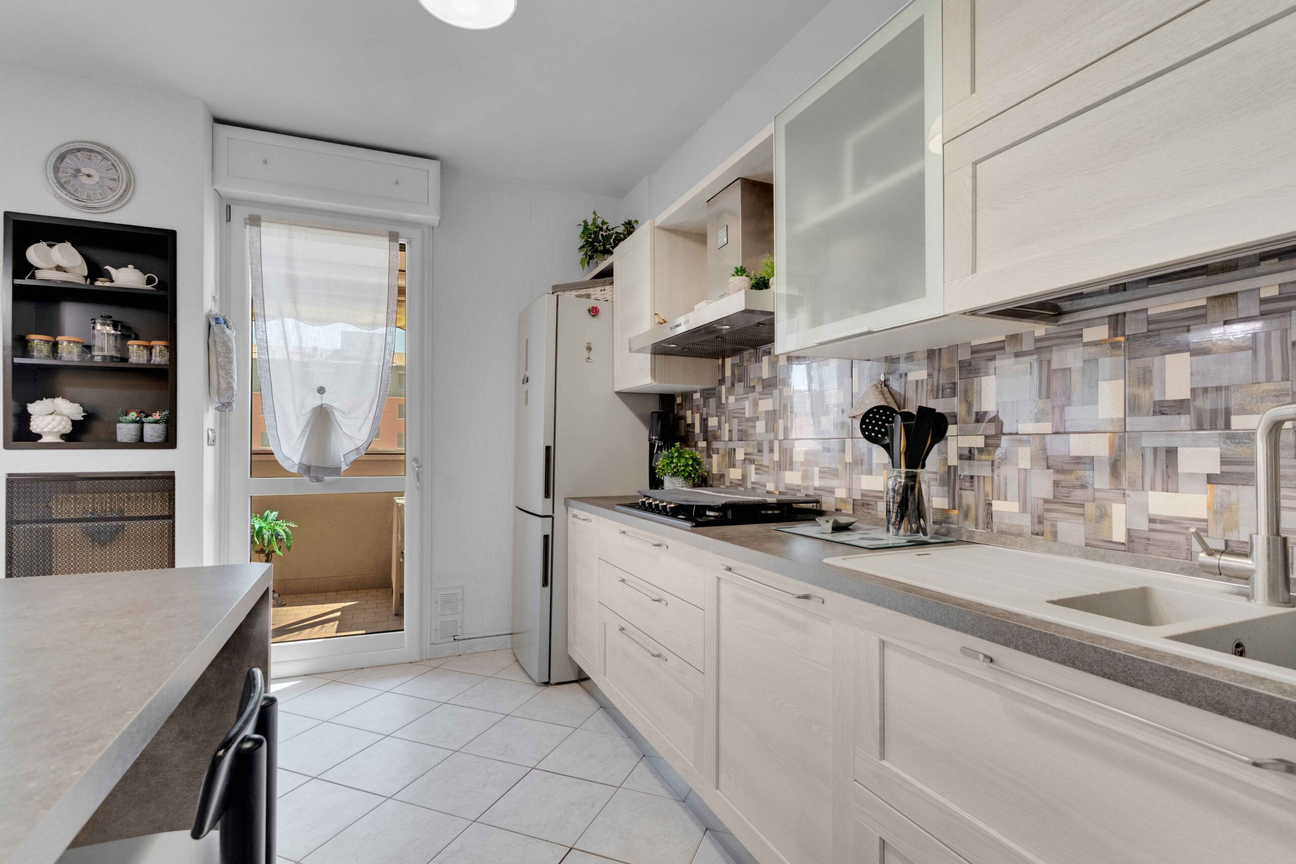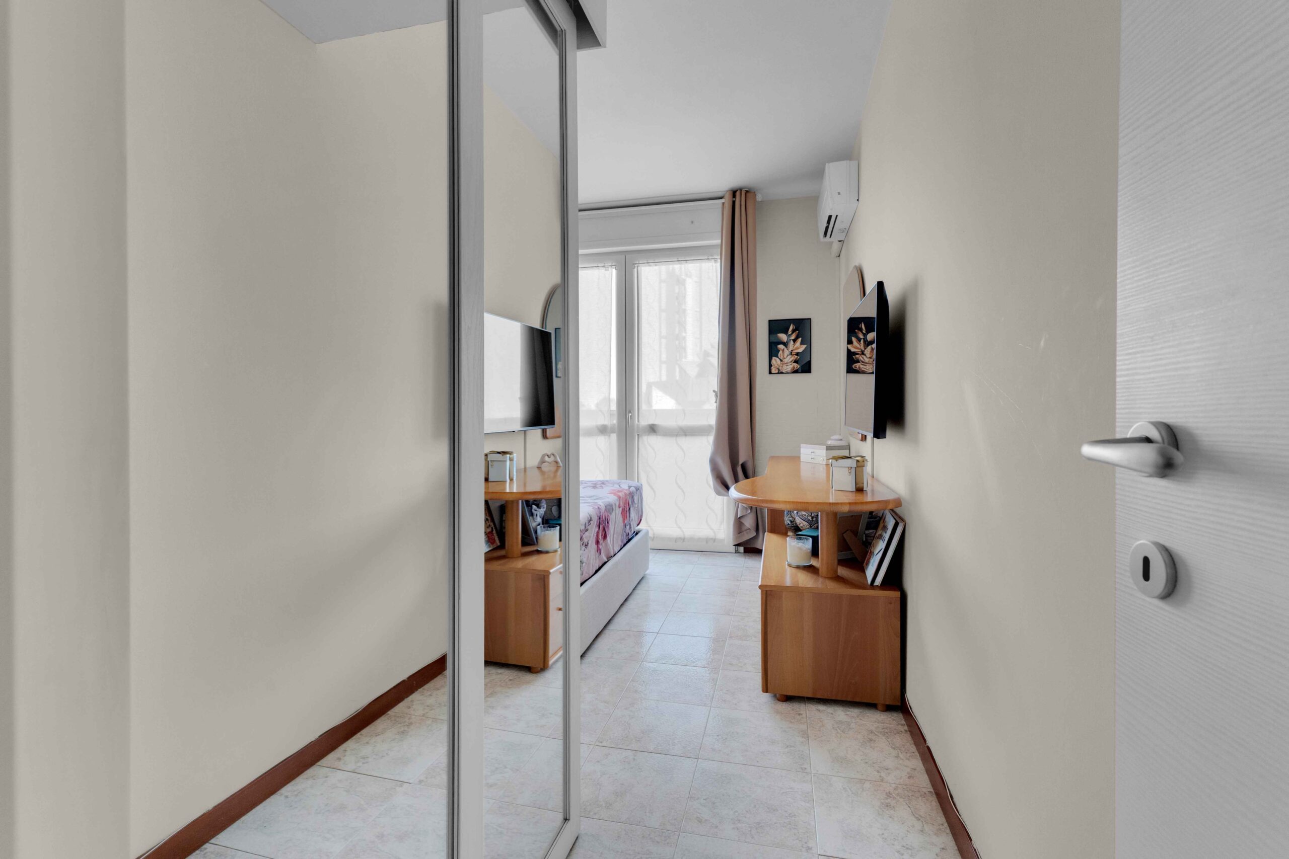 Gli infissi esterni sono di ultima generazione a tenuta termica con profili interni di colore bianco così come le porte interne. La tenda para sole è stata posizionata sul balcone più ampio in quanto esposto ad est che risulta anche protetto da zanzariere a filo balcone.