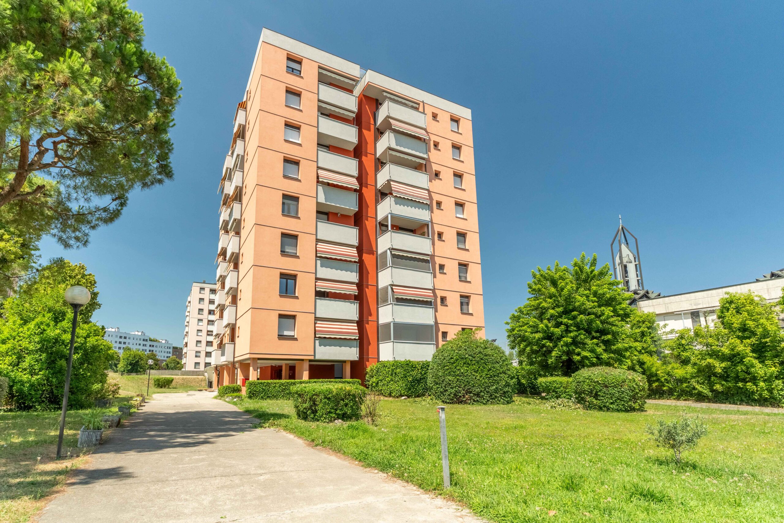 Varcato il cancello d’ingresso fronte strada si percorre un tratto di vialetto interno che attraversa il giardino condominiale fino a raggiunge il portoncino a vetri dove è presente il secondo gruppo di citofoni.